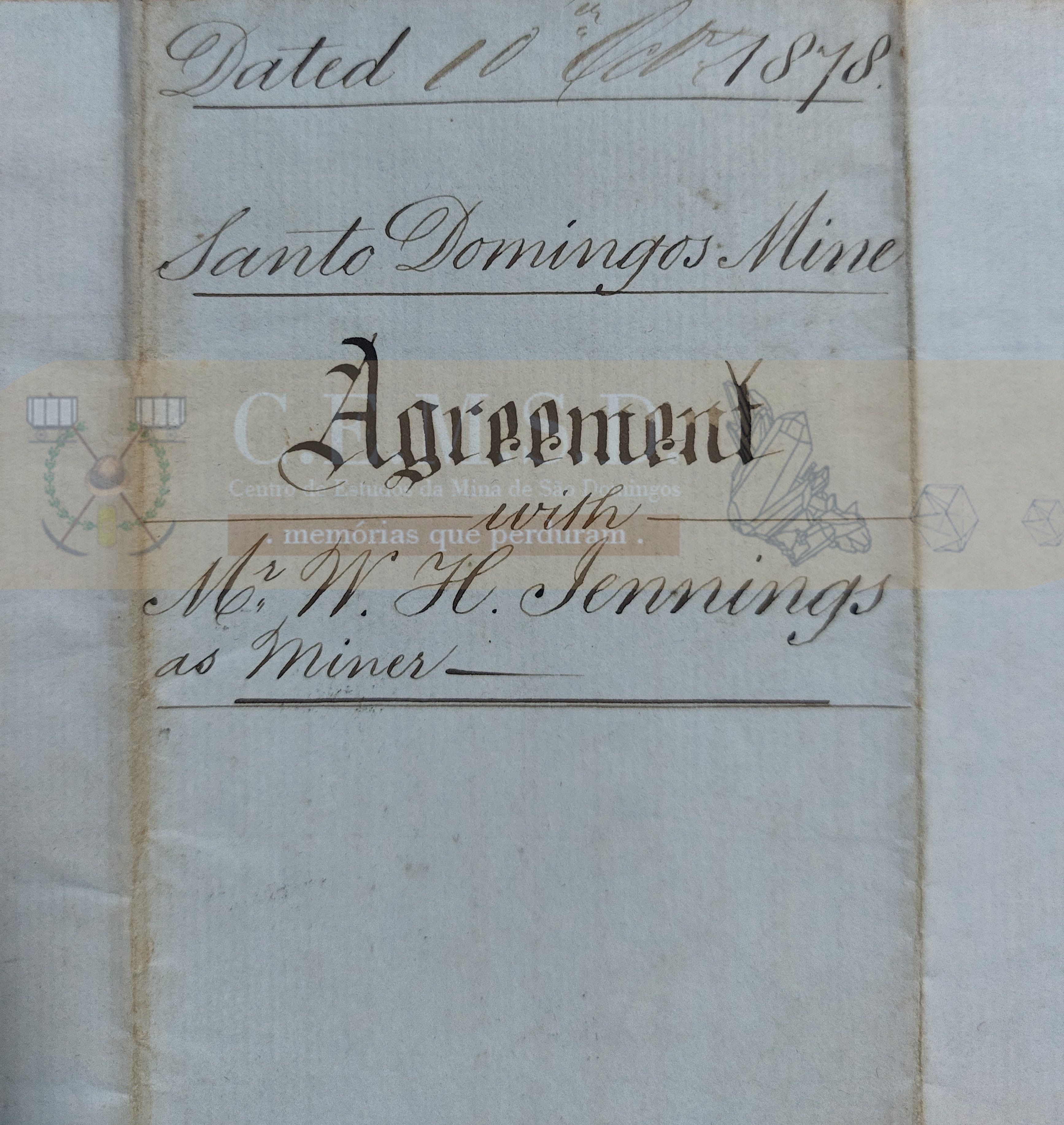 Este contrato feito em Londres neste décimo dia de Outubro de mil oitocentos e setenta e oito Entre James Mason das Minas de Santo Domingos em Mértola no Reino de Portugal e de N.º 87 Cannon Street na Cidade de Londres Cavalheiro de uma parte e William Henry Jennings de Camborne no Condado de Cornwall Mineiro e trabalhador prático de perfuradoras de rocha da outra parte (...)