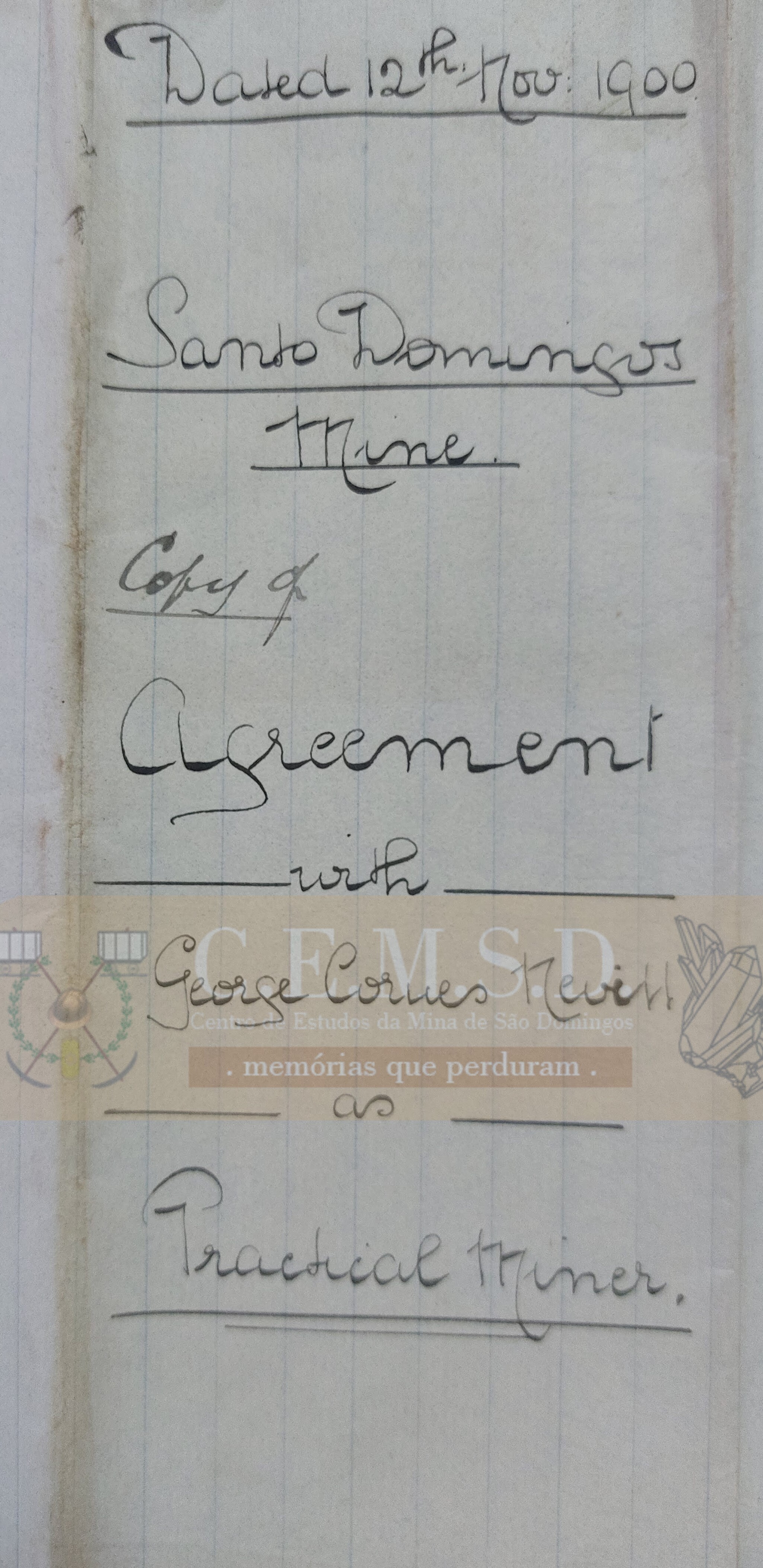 Um Acordo feito em Londres neste décimo segundo dia de novembro do ano de Nosso Senhor mil novecentos- Entre Mason and Barry Limited das Minas de Santo Domingos, Merthola, no Reino do Portugal e do nº 87 Cannon Street na cidade de Londres, uma Companhia Mineira, de uma parte e George Cornes Nevitt, Mineiro Prático, da outra parte; Pelo qual cada um, na medida em que este Acordo deva ser cumprido por ele em consideração do acordo do outro, concorda com o seguinte: ou seja, O referido George Cornes Nevitt concorda que ele, irá, em tal tempo e maneira, o mais tardar no primeiro dia de dezembro de mil e novecentos, como a dita Companhia ou o seu agente ou gerente pode nomear, deve prosseguir para Portugal com o propósito de agir e trabalhar como um Mineiro Prático para a dita Companhia, seus sucessores ou cessionários nas minas supracitadas ou quaisquer outras das suas minas ou obras presentes ou futuras em Portugal e as ferrovias, linhas de tramway e obras a elas conectadas e, em particular, dedicar-se, o dito George Cornes Nevitt, a ensinar aos homens nativos da dita Companhia, seus sucessores ou cessionários, no ofício ou negócio de mineração prática e, geralmente, a assistir os Gerentes, Agentes, Engenheiros e outras pessoas empregadas pela dita Companhia.(...) contrato