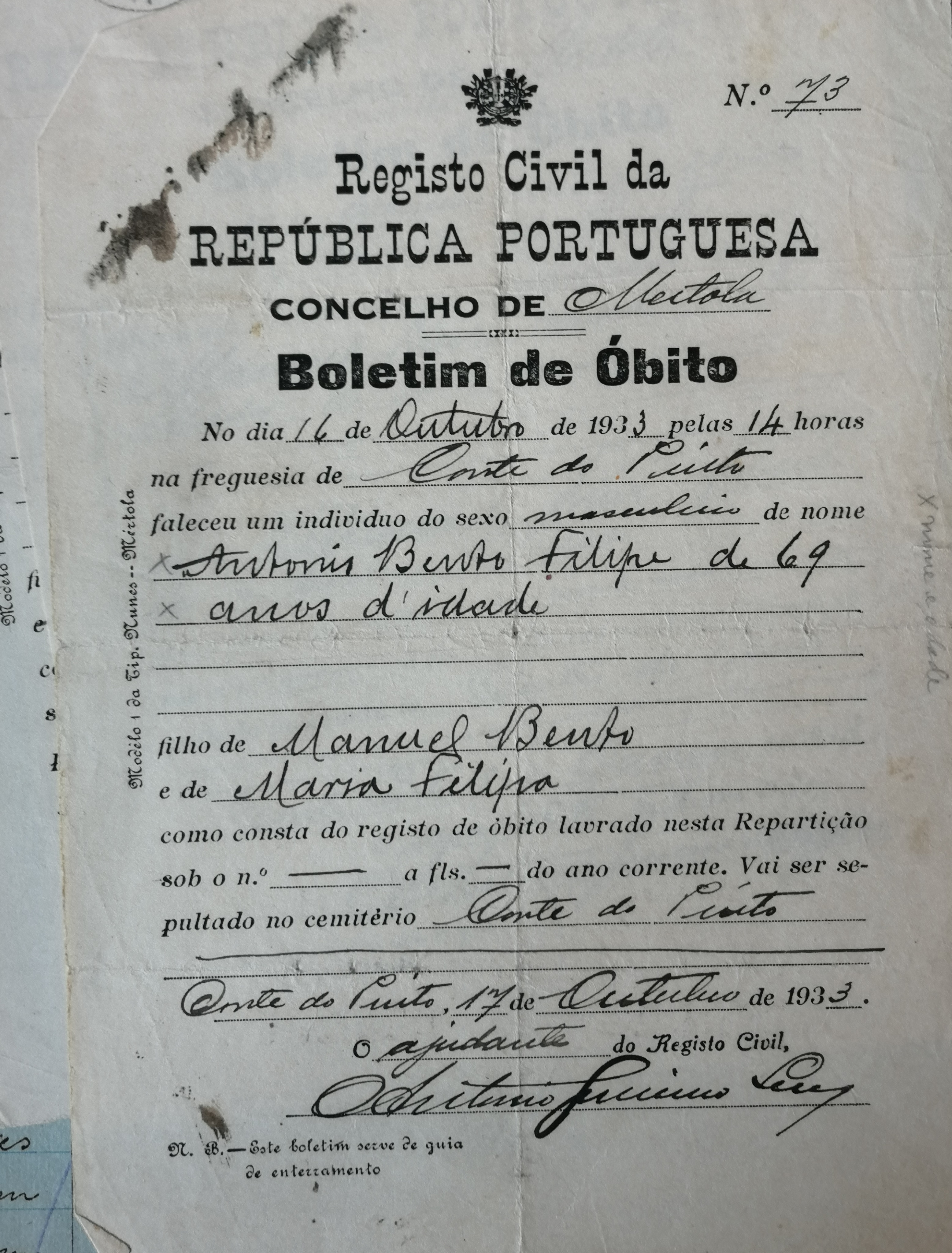 Nome do Pai: Manuel Bento Nome da Mãe: Maria Filipa Data de Nascimento: 1864-??-??Data de Falecimento: 1933-10-16Local de Falecimento: Corte do PintoLocal da Sepultura: Cemitério da Corte do PintoInformação Pessoal: Biografia Assento de Óbito: