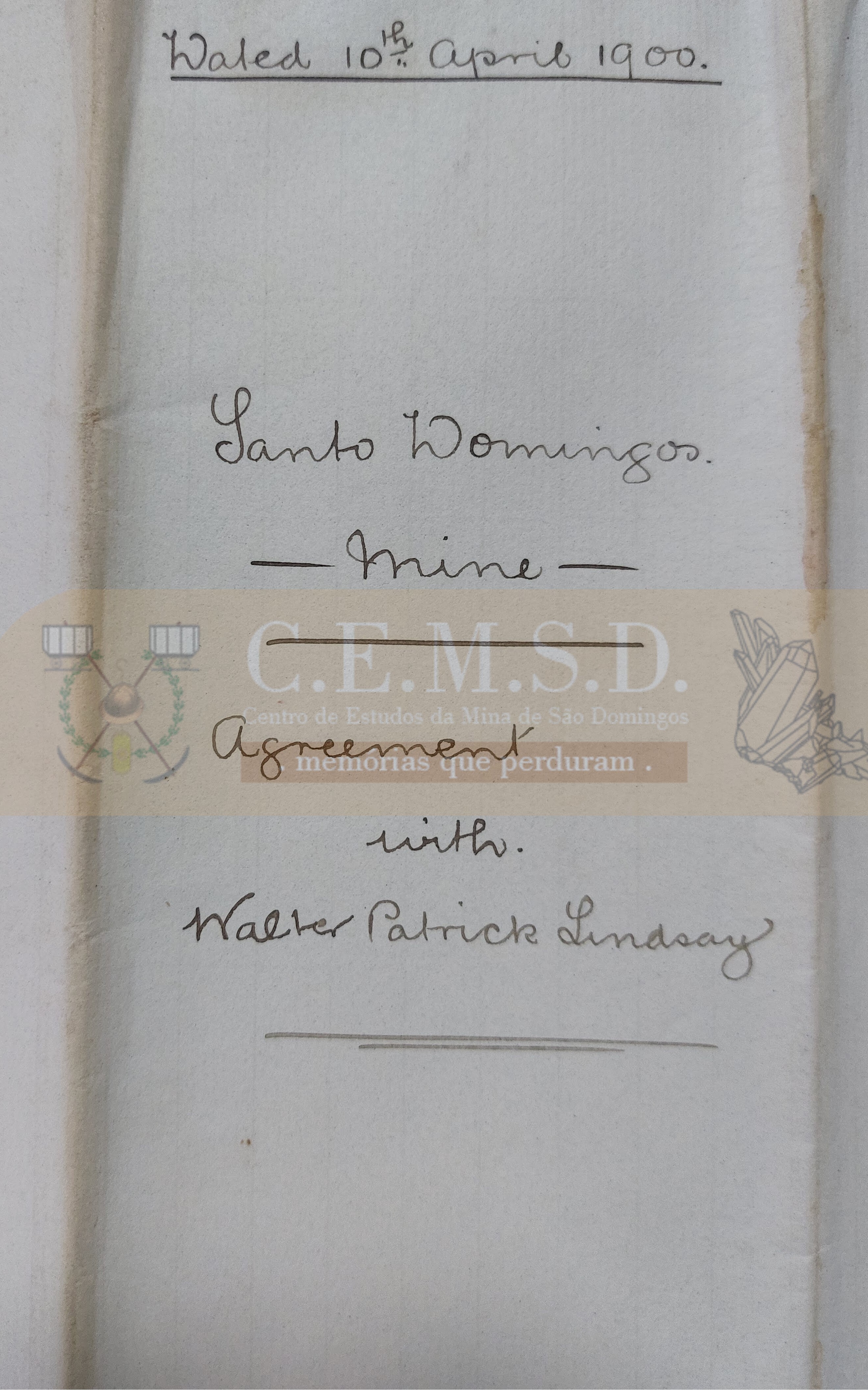 O referido Walter Patrick Lindsay concorda que ele, o referido Walter Patrick Lindsay, estando agora nas supracitadas minas de Santo Domingos, atuará e trabalhará como ajustador para e assistirá no desenho para a referida Empresa, seus sucessores ou cessionários nas supracitadas Minas ou quaisquer outras das suas minas presentes ou futuras ou Obras em Portugal e as ferrovias, linhas de elétricos e obras a elas ligadas. E, em particular, dedicar-se-á, o referido Walter Patrick Lindsay, a ensinar os homens nativos da referida Empresa, seus sucessores ou cessionários, no ofício ou negócio de desenho e ajuste. E, no geral, a assistir os gerentes, agentes, engenheiros e outras pessoas empregadas pela referida Empresa, seus sucessores ou cessionários, nas ditas minas e em todas as operações a elas conectadas e a conformar-se o dito Walter Patrick Lindsay às regras gerais e costumes já estabelecidos ou a serem estabelecidos pela dita Companhia seus sucessores ou cessionários ou quaisquer de seus gerentes, agentes ou engenheiros nas ditas minas pelo período de três anos a serem contados a partir do primeiro dia de abril de mil oitocentos e noventa e nove (...) Excerto do contrato