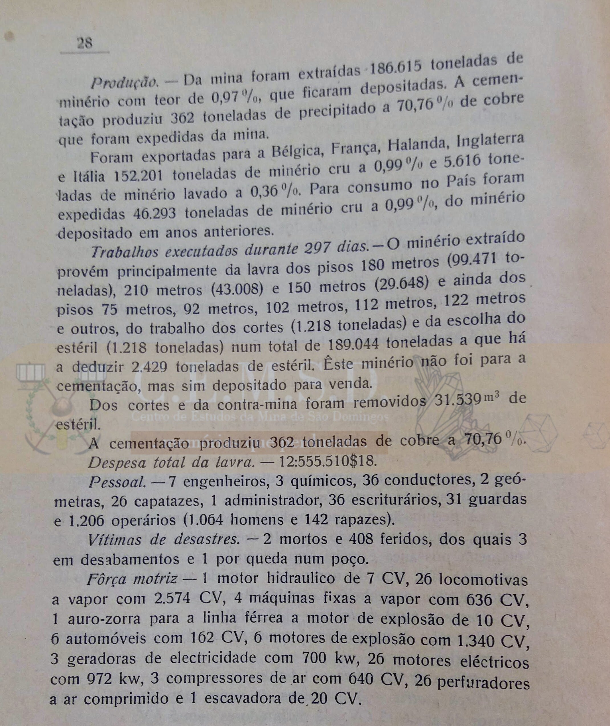 A cementação produziu 362 toneladas de cobre a 70,76 Despesa total da lavra. 12:555.510$18.