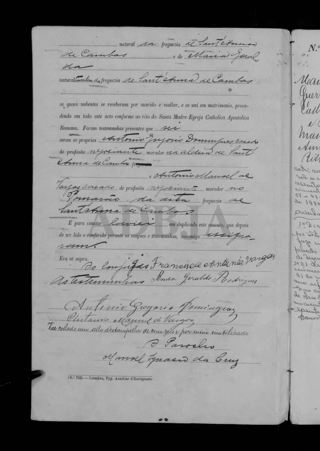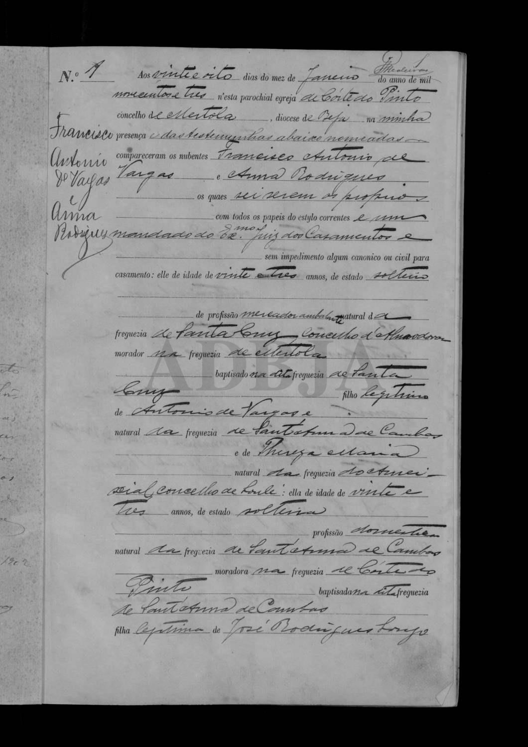 Estado Civil: Casado Nome do Cônjuge: Ana Rodrigues Data do Casamento: 1903-01-28Local do Casamento: Corte do Pinto Informação Pessoal: Biografia Assento de Casamento: Assento de Casamento (2ªs núpcias):