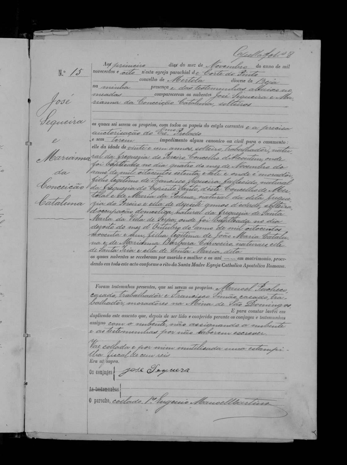 Local do Registo: SerpaDistrito / Pais (se for estrangeiro): BejaConcelho: SerpaFreguesia: Santa Maria de SerpaEstado Civil: CasadaNome do Cônjuge: José Sequeira Data do Casamento: 1908-11-01Local do Casamento: Corte do Pinto Informação Pessoal: Biografia Assento de Casamento: