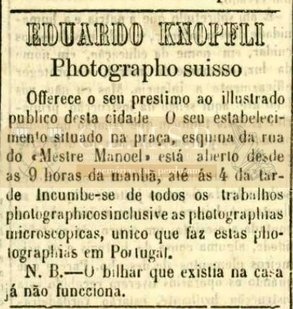 Offerece os seus prestimos ao illustrado publico desta cidade. O seu estabelecimento situado na praça, esquina do “Mestre Manoel” está aberto desde as 9 horas da manhã, até ás 4 da tarde. Incumbe-se de todos os trabalhos photographicos inclusive as photographias microscopicas, único que faz estas photographias em Portugal.