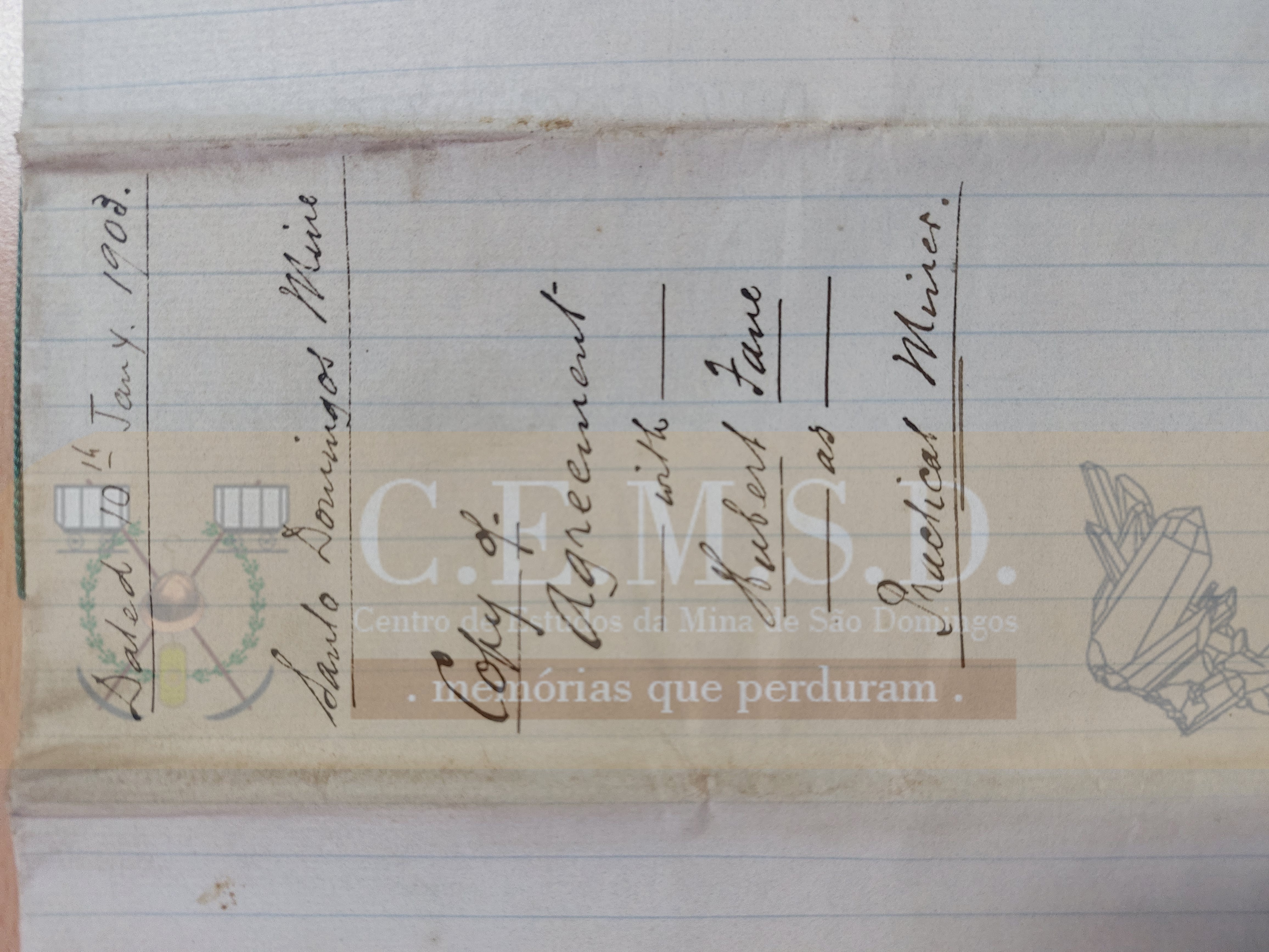 Um Acordo feito em Londres neste décimo dia de janeiro no ano de Nosso Senhor Mil Novecentos e Três- Entre Mason and Barry Limited das Minas de Santo Domingos, Mértola no Reino de Portugal e do Nº 87 Cannon Street na Cidade de Londres, Companhia Mineira de uma parte e Hubert Fane também de Santo Domingos, Mértola, Portugal, Mineiro Prático da outra parte. Pelo qual cada um, na medida em que este Acordo deva ser cumprido por ele em consideração ao acordo do outro deles aqui contido, concorda o seguinte, ou seja: O referido Hubert Jane concorda que ele, o referido Hubert Fane, a partir do primeiro dia de janeiro de mil novecentos e três, agirá e trabalhará como mineiro prático para a referida empresa.(...) (Contrato)