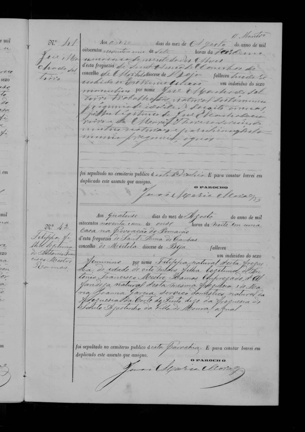 Aos quatorze dias do mez de Agosto do anno de mil oitocentos noventa e um, ás onze horas da noite em uma casa na povoação de Pomarão d'esta freguesia de Santa Anna de Cambas, concelho de Mertola, diocese de Beja, falleceu um individuo do sexo feminino por nome Filippa natural d'esta freguesia, de idade de oito mezes, filha legitima de Antonio Francisco Mestre, Ramos empregado de Alfandega natural d'esta mesma freguesia e de sua mulher Anna Joanna Garcia, serviço domestico natural da freguesia de Corte de Pinto, diocese de Beja da freguesia de Santo Agostinho d'esta villa de Moura.