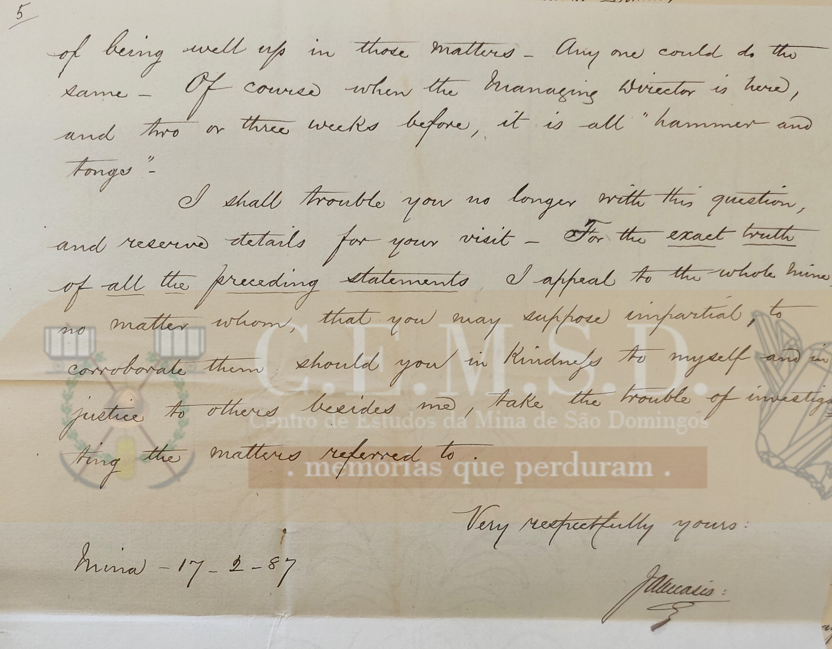 Não o incomodarei mais com esta questão, reservando mais detalhes para a sua visita. Quanto à veracidade de tudo o que precede, apelo a toda a mina — a quem considerar imparcial para confirmar estas declarações, caso tenha a gentileza, em consideração por mim e por justiça para com os outros, de investigar os factos referidos.