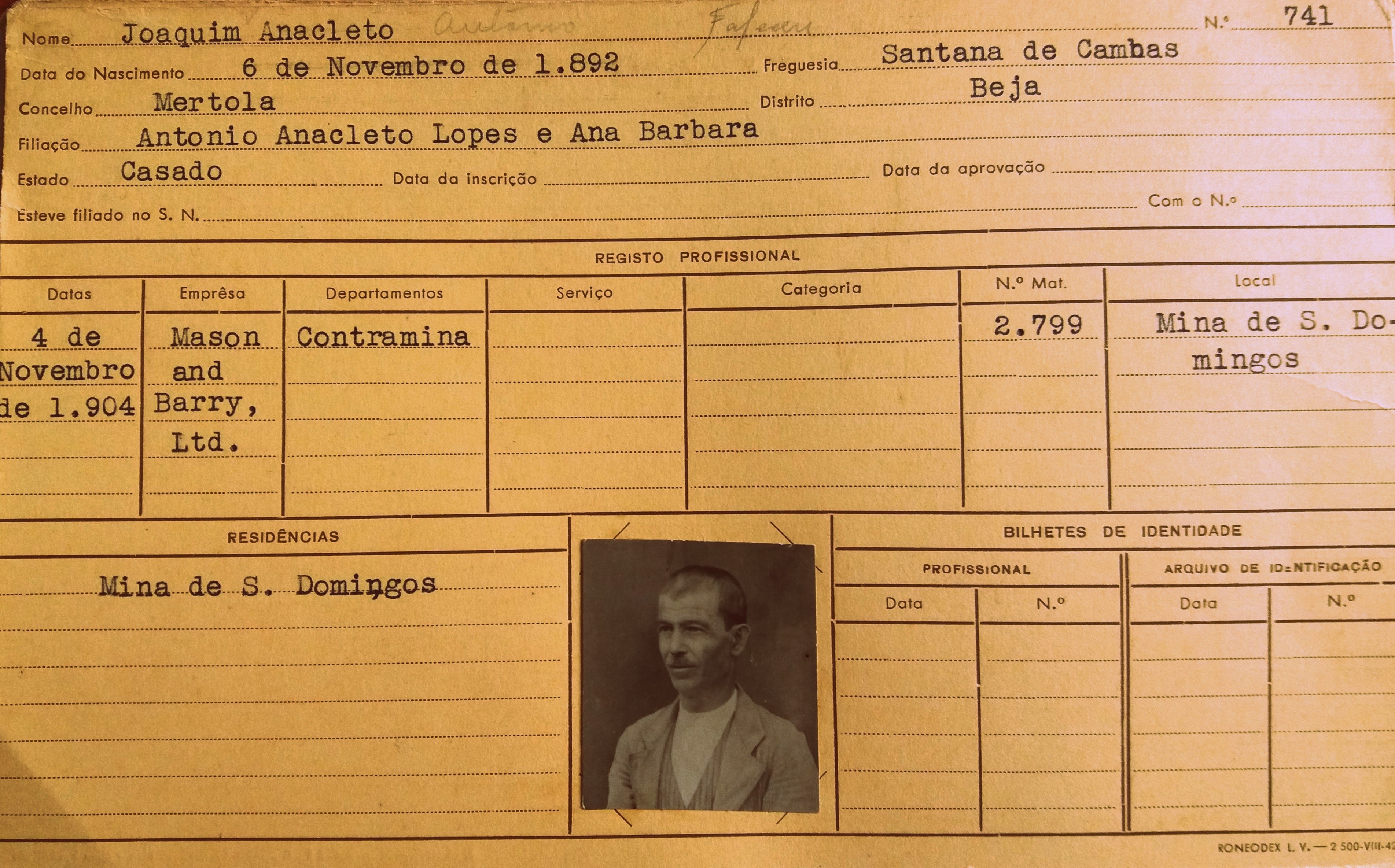 quando a vítima procedia à colocação de um quadro em avanço desprendeu se um bloco da frente de desmonte que o colheu pelo tórax causando-lhe fraturas múltiplas das costelas.o desastre deu-se na galeria guia do norte a cerca de 8 metros para nascente da Travessa 31.foram testemunhas a parelha de trabalho da vítima José António Martins Safreiro de 1ª casado Morador no monte novo do Poço barbo Freguesia da Corte do Pinto que não assina por não o saber fazer, Manuel António Capataz 2ª casado e Manuel Alfredo encarregado casado ambos moradores na Mina de São Domingos que vão assinar este auto.
