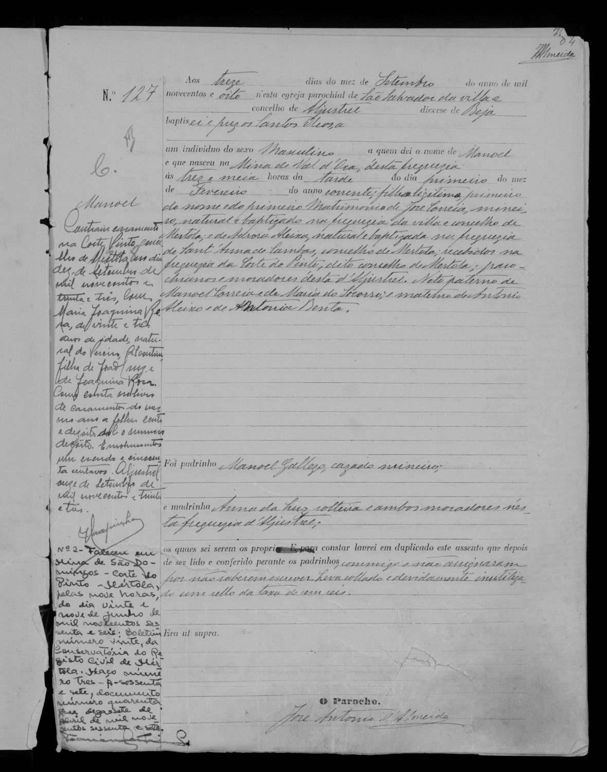 O pai era mineiro natural de Mértola.O padrinho de baptismo foi o Manuel Galego, mineiro em aljustrel.