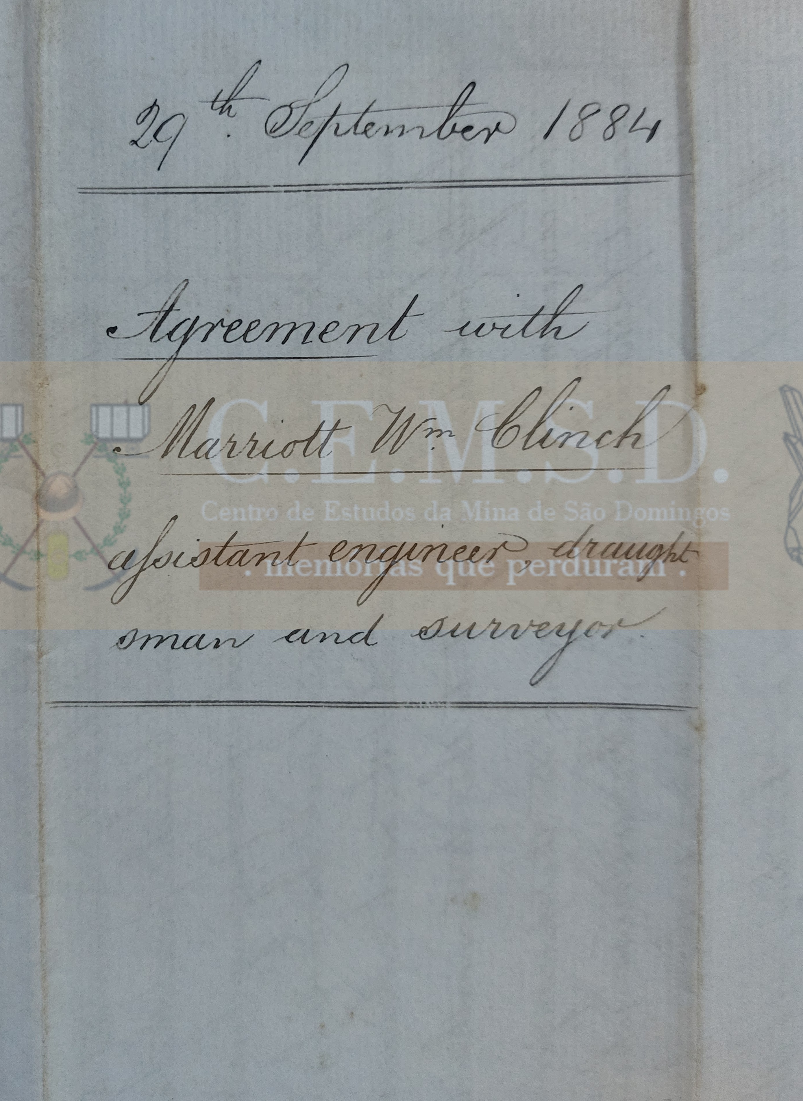 Contrato feito na Mina de S. Domingos no vigésimo nono dia de Setembro de mil oitocentos e oitenta e quatro entre a Mason and Barry limited da supracitada Mina de S. Domingos no reino de Portugal e da 84 Cannon Street na cidade de Londres de uma parte, e Marriott William Clinch agora residente na dita Mina de S. Domingos da outra parte, nos seguintes termos, que são, que ele, o dito Marriott William Clinch, concorda que irá agir e trabalhar como engenheiro assistente, desenhista e topógrafo para a dita Mason and Barry limited, seus sucessores, ou cessionários, na referida Mina e em qualquer das obras a ela ligadas e suas dependências, conforme lhe for solicitado pela dita Mason and Barry limited, seus agentes, superintendentes ou gerentes da altura, e que ele deverá e irá dedicar e dar todo o seu tempo e atenção à dita mina e obras e ao serviço da dita Mason and Barry limited, e não deverá envolver-se em qualquer outro serviço ou negócio, seja por conta própria ou como agente ou servo para ou em ligação com qualquer outra pessoa ou pessoas ou Empresas, ou dar qualquer conselho ou assistência como desenhador, agrimensor ou engenheiro assistente, exceto à dita Mason & Barry limited, seus cessionários, superintendentes ou gerentes da altura, e, quando assim desejado, deverá ensinar os jovens nativos ao serviço da dita Mason & Barry limited.homens jovens nativos ao serviço da dita Mason & Barry limited, o negócio e profissão de Engenheiro Assistente, desenhista e agrimensor, e deverá e irá cumprir todas as regras e regulamentos estabelecidos ou a estabelecer pela dita Mason & Barry limited, seus cessionários, superintendentes ou gerentes na dita mina de S. Domingos e todas essas instruções que ele possa de tempos a tempos receber da dita Mason and Barry limited lá e todas essas instruções que ele possa de tempos a tempos receber, ou possam ser prescritas pelos ditos Mason e Barry limited seus cessionários, superintendentes ou gerentes por enquanto, e deverá e irá guardar fielmente a sua propriedade de abandono, estrago e dano, e não deverá dar a qualquer pessoa ou pessoas que não os ditos Mason e atribuir superintendentes ou gerentes doze para começar qualquer informação que seja em referência ou em conexão com a supracitada Mina de S. Domingos ou com as obras a ela conectadas. E a dita Mason e Barry ou dependências da mesma limitadas e com vontade, desde que o dito Marriott William Clinch continue no seu emprego como supracitado, pagar ou fazer pagar ao dito Marriott William Clinch o salário de doze libras de dinheiro britânico por mês de calendário, tal salário, a partir do primeiro dia de Setembro instantâneo, e deverá e continuará a fornecer ao dito Marriott William Clinch uma habitação adequada, cama, armário, mesa e banco, água, assistência médica e medicamentos como até agora, e deverá e continuará a fornecer ao dito Marriott William Clinch uma passagem de segunda classe para a Inglaterra após a rescisão do presente acordo. E também é pelo presente mutuamente acordado entre as partes que nenhum termo especificado será fixado para a duração do presente acordo, mas que sempre que qualquer das partes pretenda e deseje rescindir o mesmo, será lícito para elas ou para ele fazê-lo, dando à outra parte dois meses de aviso por escrito dessa intenção ou desejo, e no caso de tal aviso proceder da dita Mason and Barry Limited, ou dos seus cessionários, agentes, superintendentes ou gerentes em seu nome, então será opcional para eles reter os serviços do dito Marriott William Clinch durante os referidos dois meses de aviso por escrito ou pagar-lhe o salário correspondente a tais dois meses, ficando o dito Marriott William Clinch em liberdade de sair imediatamente da dita Mina de S. Domingos sem esperar pelo fim de tal aviso de dois meses. Desde que, no entanto, o dito Marriott William Clinch não se tenha má conduta de forma alguma durante a vigência deste acordo, conforme referido.se o referido desobedecer às ordens ou instruções dos seus ou do gerente da Mason and Barry Limited, superintendente na altura, ou por motivo de embriaguez ou por qualquer outra causa, então e em qualquer um ou outro desses casos, a referida Mason and Barry Limited, ou os seus cessionários, superintendentes ou gerentes em seu nome, terão a liberdade de demitir imediatamente o referido Marriott William Clinch do serviço da referida Barry Limited, mediante o pagamento do salário que lhe possa ser devido no momento da demissão, à taxa estipulada no presente acordo, o referido Marriott William Clinch perde assim o direito ao aviso prévio por escrito de dois meses ou ao salário correspondente, e à passagem para Inglaterra, conforme estabelecido anteriormente. Em testemunho do que as partes no presente acordo assinaram na referida Mina de S. Domingos no dia, mês e ano acima escritos,Mason & Barry - limitada